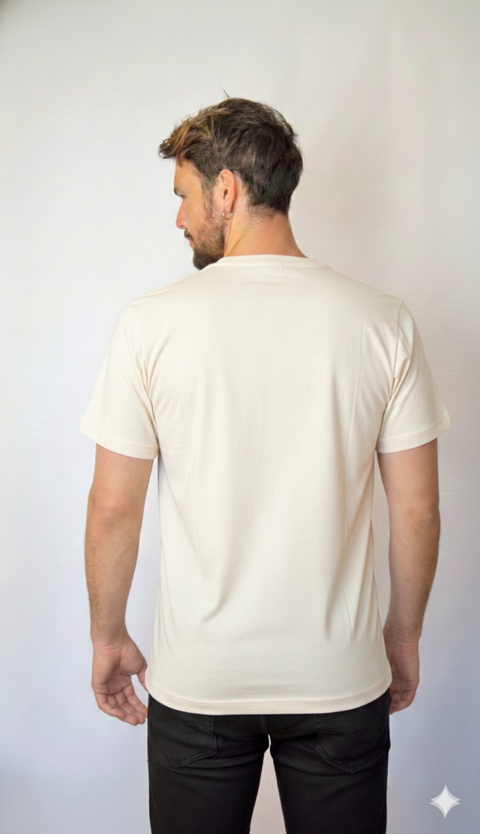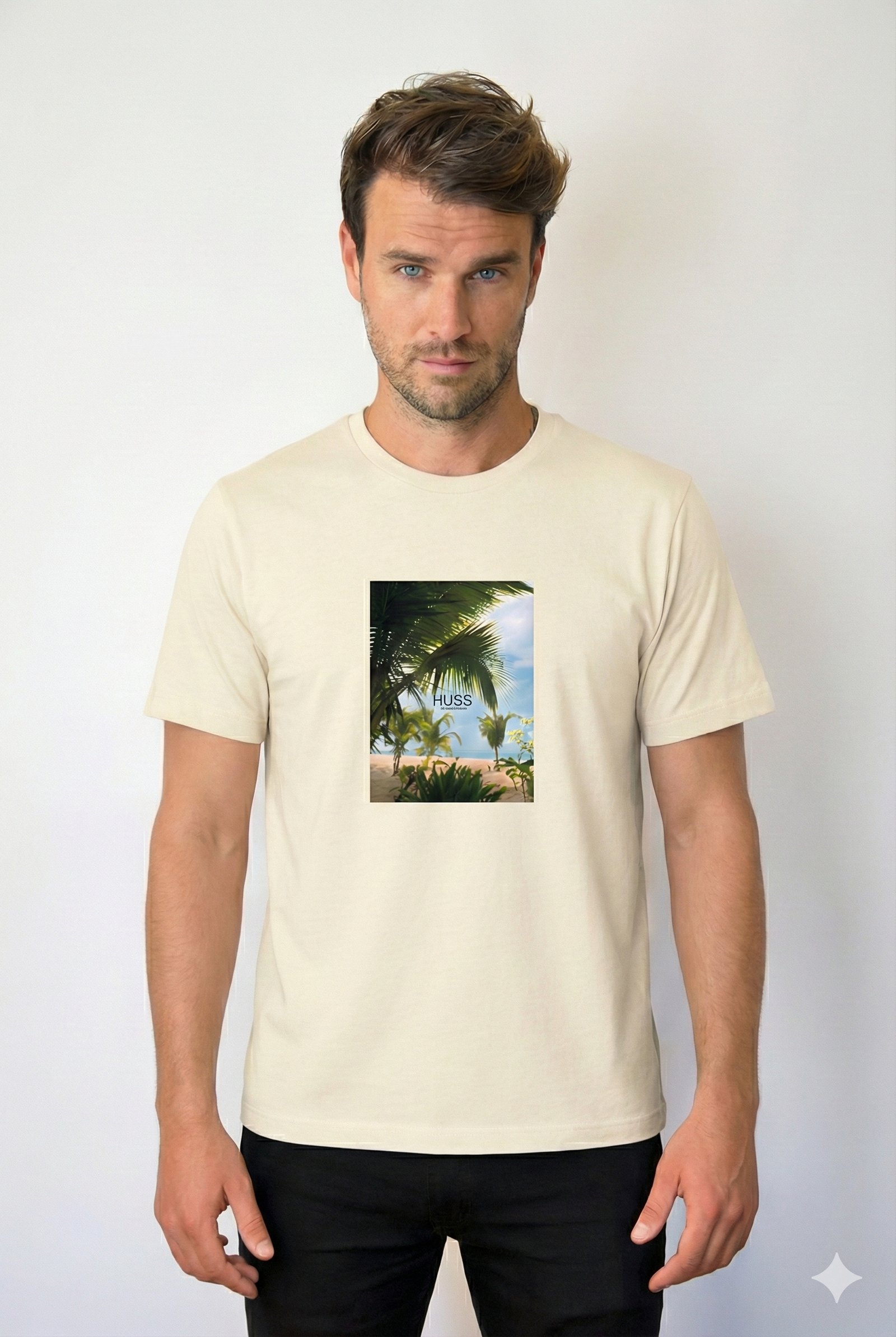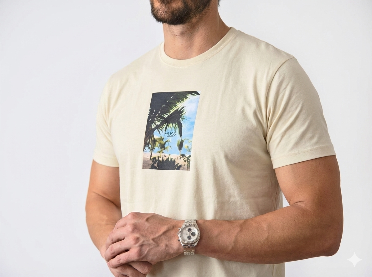 Polera informal tipo camiseta manga corta con escote redondo, calce regular. Estampado frontal fotográfico con logo Huss.