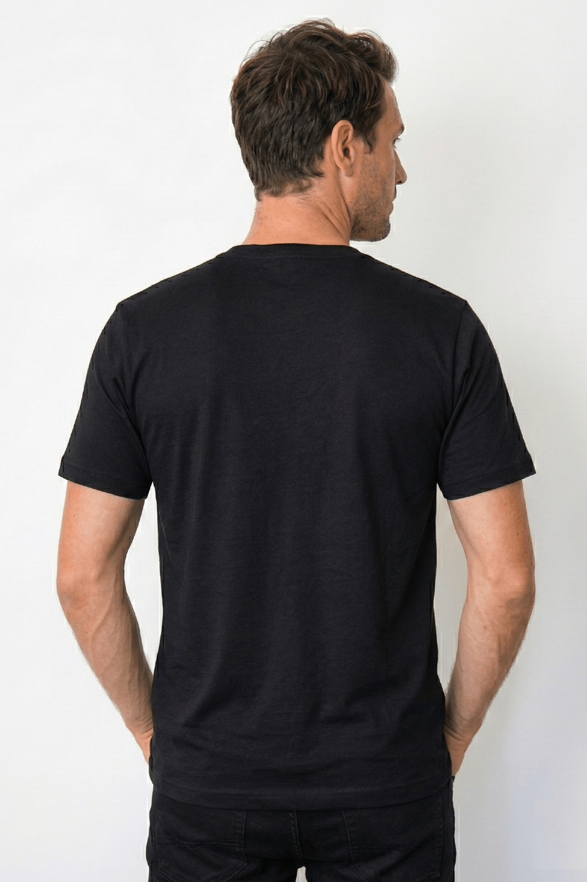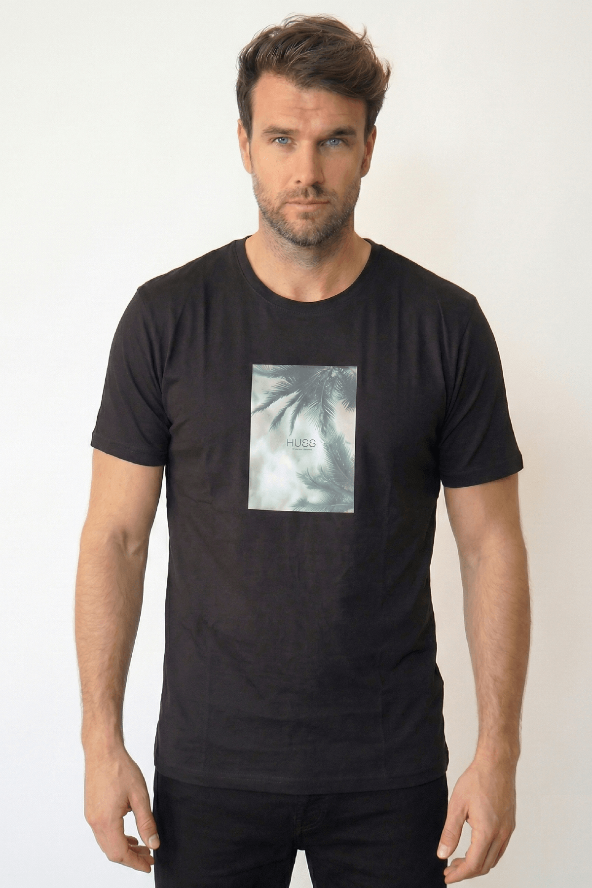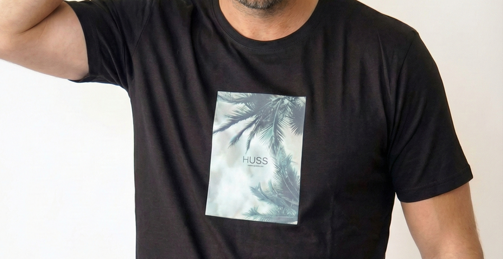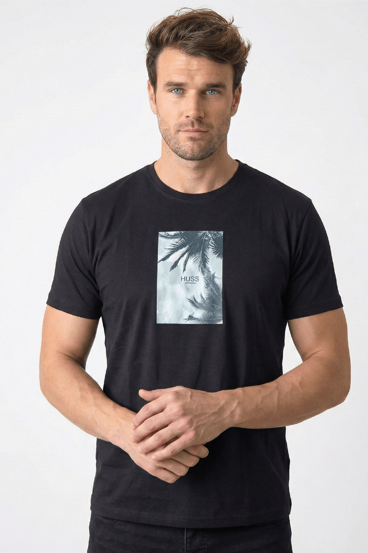 Polera informal tipo camiseta manga corta con escote redondo, calce regular. Estampado frontal fotográfico con logo Huss.