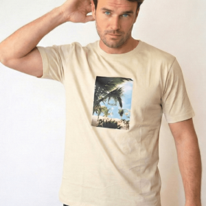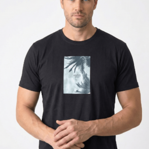 Polera informal tipo camiseta manga corta con escote redondo, calce regular. Estampado frontal fotográfico con logo Huss.