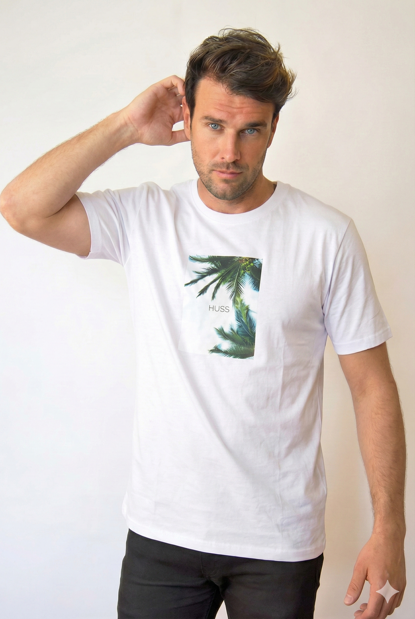 Polera informal tipo camiseta manga corta con escote redondo, calce regular. Estampado frontal fotográfico con logo Huss.